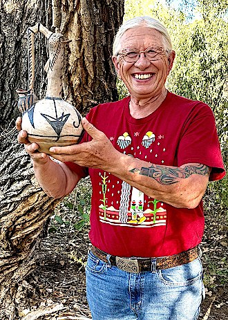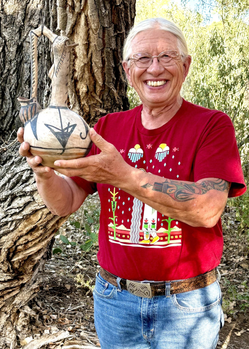 Chuck with a San Ildefonso Powhoge Polychrome effigy pitcher by Marianita Roybal, circa 1880